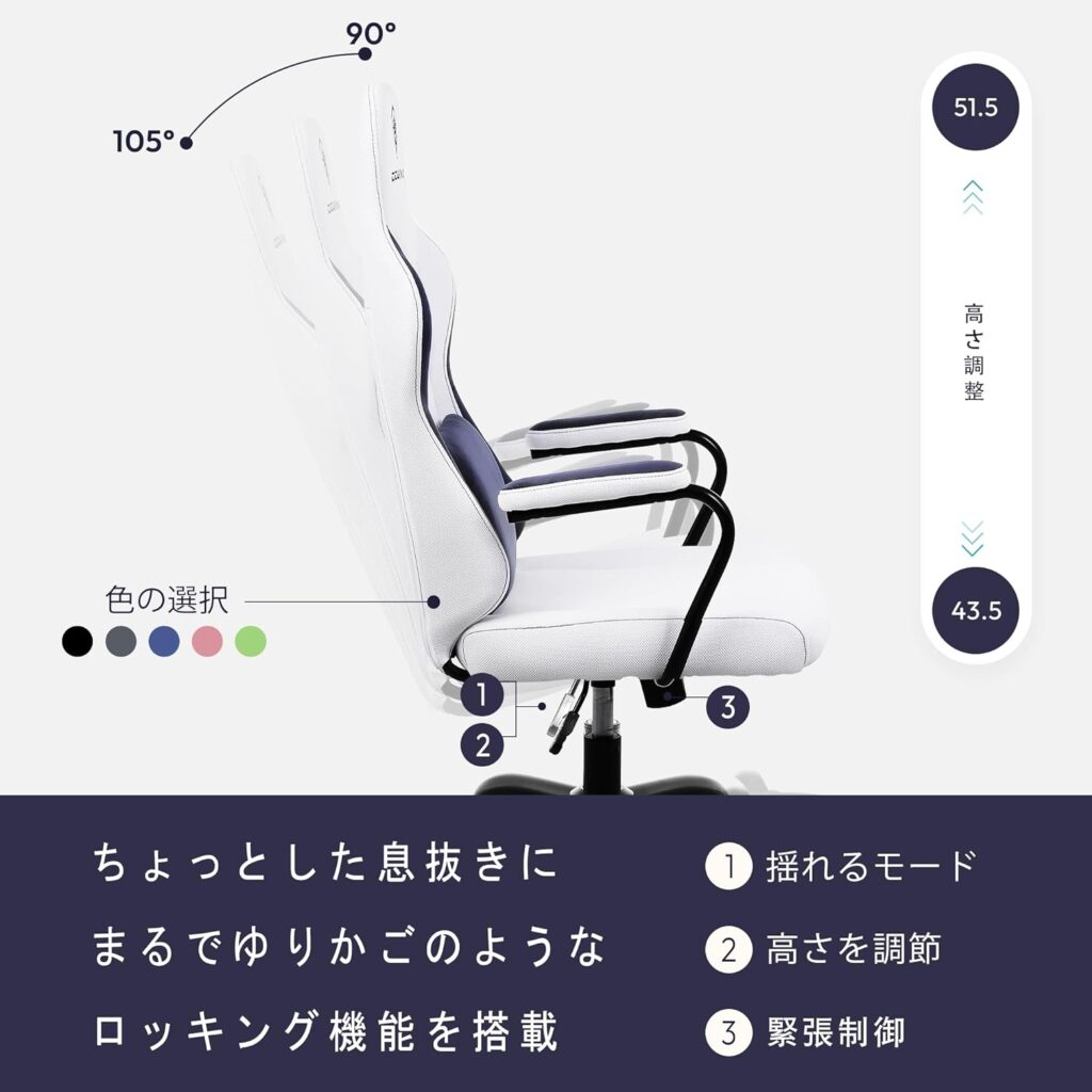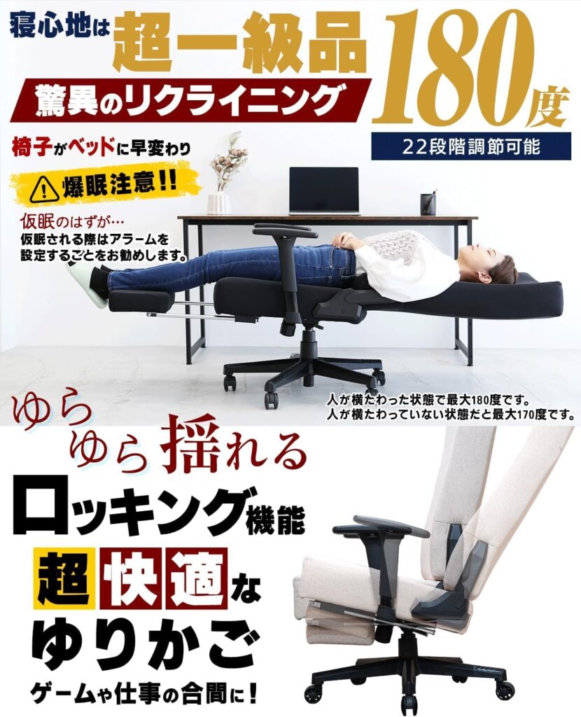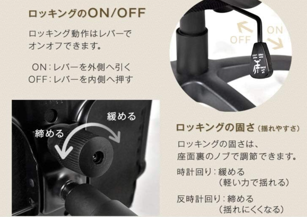 - リラックス効果:ロッキング機能は、座面や背もたれを後ろに傾けることで、身体をリラックスさせることができます。