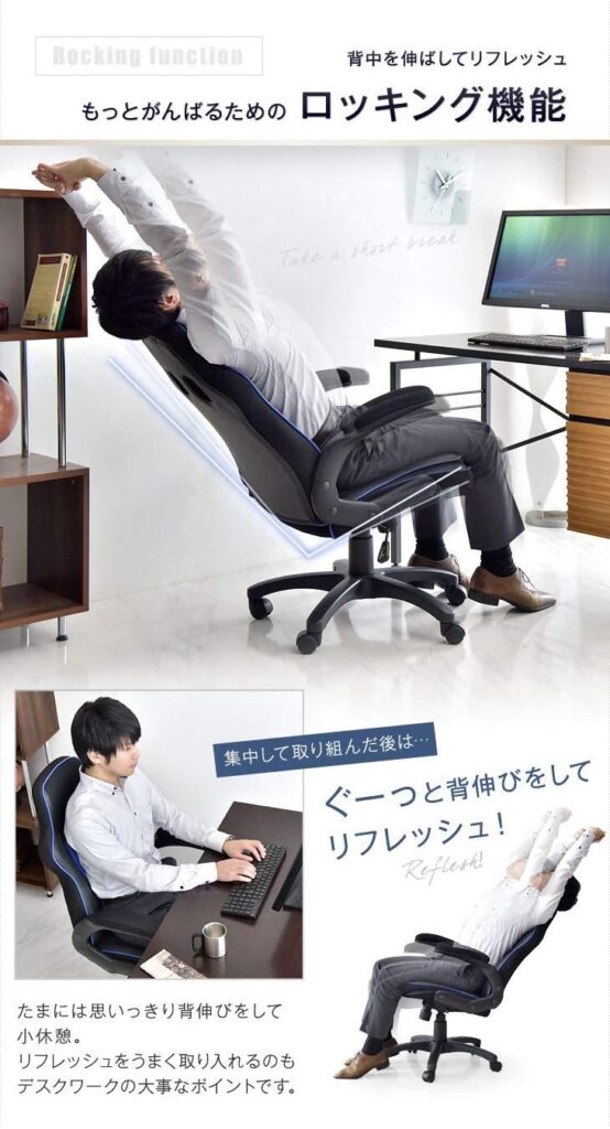 S字構造でカラダにフィットし、ロッキング機能も搭載されているため、リラックスしながら作業をすることが可能です。