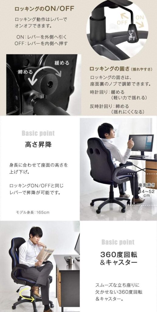 また座面の昇降とロッキング機能で、一日中快適に過ごすことができます。