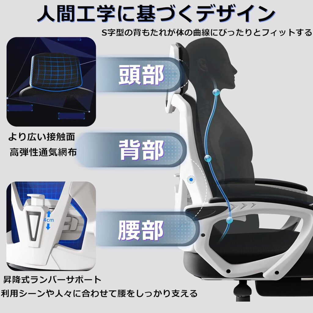 ランバーサポートが健康的な姿勢をサポートし疲れにくいゲーミングチェアです。
