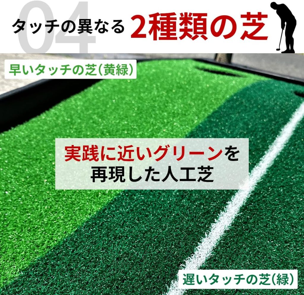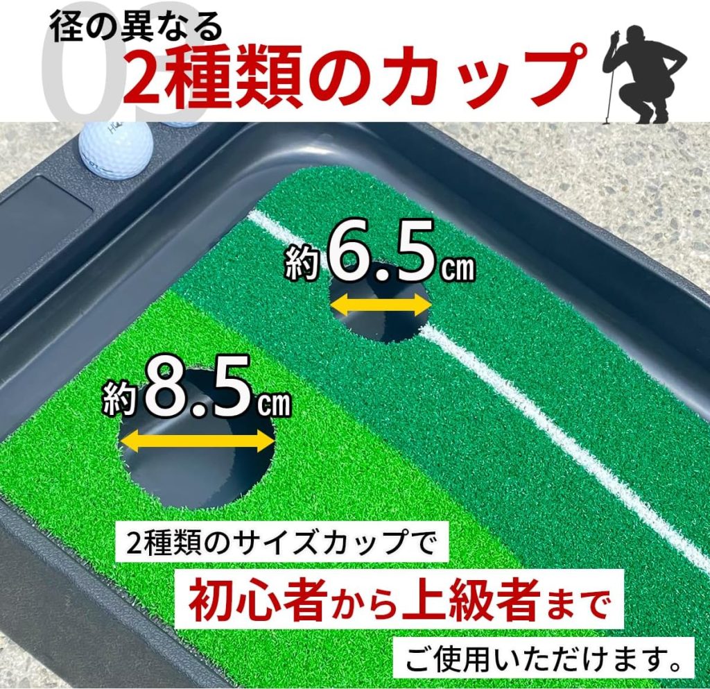 特に注目すべきは、マットには3つの異なるホールが付いており、それぞれに角度や傾斜ラインが異なる設計になっています。これにより、さまざまな状況での練習が可能であり、特に方向性と集中力の強化に効果的です。また、裏面には滑り止めのラバー加工が施されており、安定したプレイを保証します。さらに、芝の厚みによって異なる力加減を体感できるため、コースでしかできなかった微妙な練習も自宅で実現できます。