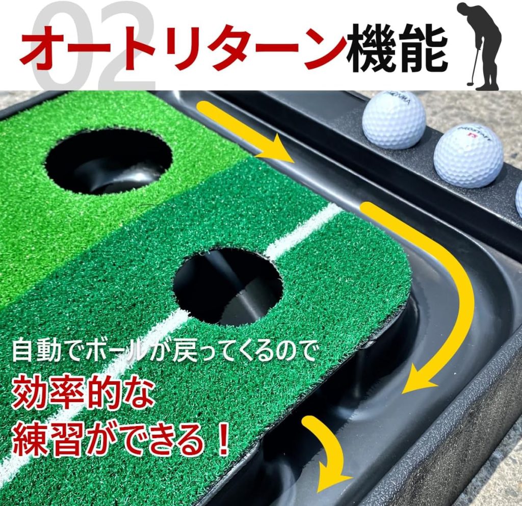 一番の特徴は、自動返球機能です。ボールがカップインするか、奥のガードまで行くと、傾斜を下り、元の位置に戻ってきます。これにより、何度もボールを拾いに行く手間が省け、効率よく反復練習が可能です。