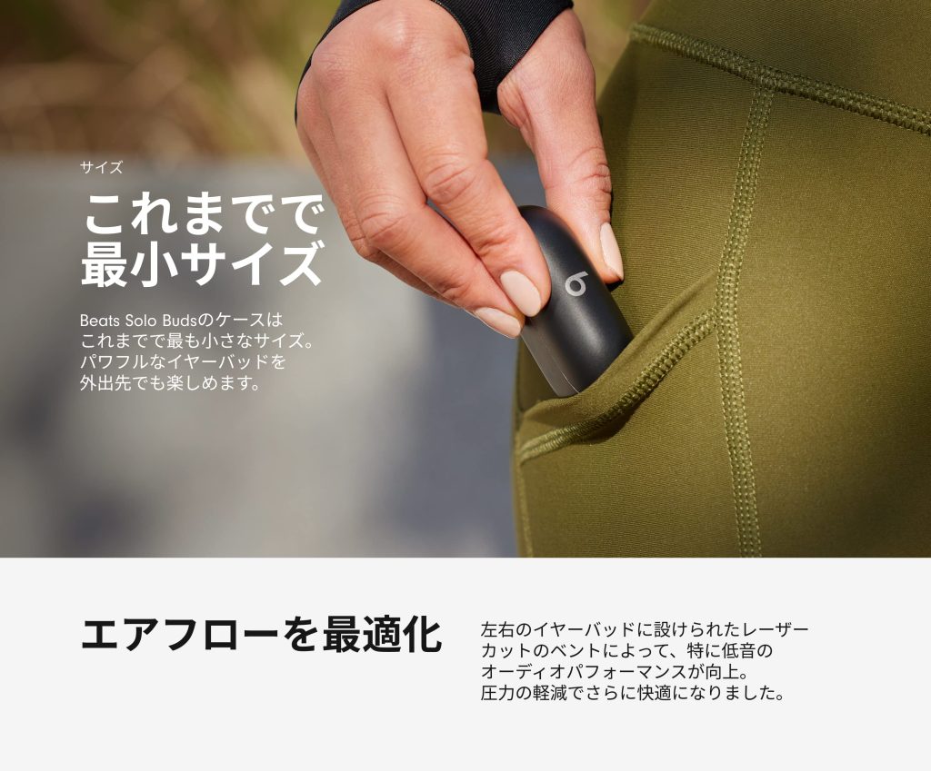 Beats Solo Budsは、これまでのBeatsイヤフォンで最も小さなケースに収められており、非常に持ち運びやすい設計です。バッグやポケットにすっきりと収まるため、通勤や通学、旅行などあらゆるシーンで手軽に持ち運ぶことができます。さらに、ケースのデザインもマットブラックのシックなカラーが採用されており、スタイリッシュな見た目が一層際立ちます。ケースの小ささにもかかわらず、イヤフォン自体は非常にパワフルで、高品質なサウンドをいつでもどこでも楽しめる点が特徴です。