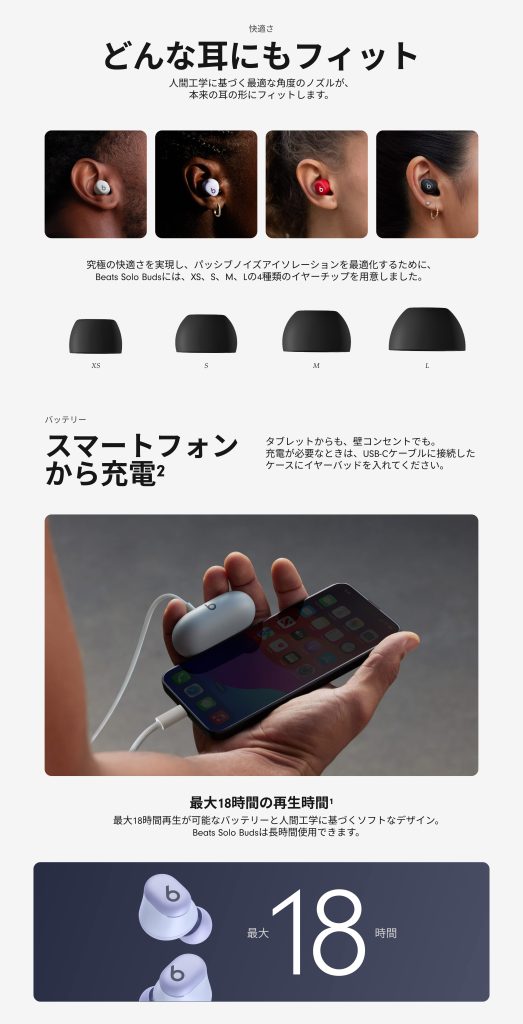 Beats Solo Budsは、最大18時間の連続再生が可能な大容量バッテリーを搭載しています。これにより、1日の使用はもちろん、数日にわたって充電を気にせず使用することができます。また、バッテリー残量が少なくなった際にはFast Fuel機能が便利で、わずか5分の充電でさらに1時間の再生が可能です。この急速充電機能により、外出前の短時間充電でも十分に使えるため、急な予定や忙しい朝にも安心です。音楽を途切れることなく楽しみたい方にとって、このバッテリー性能と急速充電は大きな利点です。