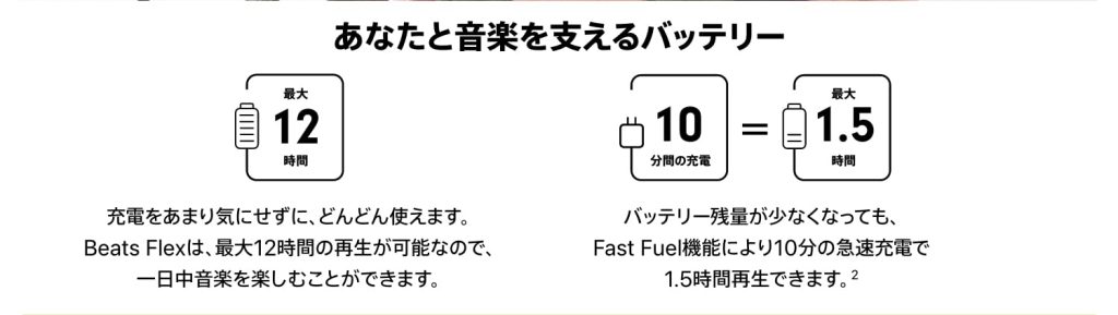 Beats Flexは、最大で12時間の連続再生が可能なバッテリーを備えており、通勤・通学からフィットネス、長時間の移動まで一日中活躍します。また、バッテリー残量が少なくなったときには、わずか10分の充電で最大1.5時間再生できる急速充電機能も搭載されているため、急いでいるときや充電が必要なときにも便利です。これにより、バッテリーの心配をすることなく、長時間音楽や通話を楽しむことができます。