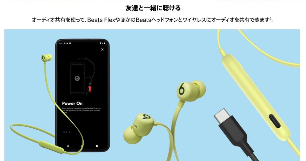 Beats Flexは、AppleのW1ヘッドフォンチップを搭載しており、Appleデバイスとの接続が驚くほどスムーズです。W1チップは、Apple製品であるiPhone、iPad、Macなどとペアリングする際に、ワンタップで接続が完了するため、ユーザーにとって煩わしい手間が省かれています。また、接続の安定性も向上しており、音の途切れが少なく快適な音楽体験が可能です。Appleのエコシステムを活用している方には、最適なイヤホンと言えるでしょう。さらに、このチップにより「オーディオ共有」機能が利用でき、他のBeatsヘッドフォンやAirPodsと音楽をシェアすることができます。これにより、友人や家族と同じ音楽を同時に楽しむことが可能です。