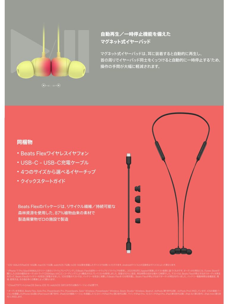 Beats Flexには、柔軟で耐久性の高いFlex-Formケーブルが採用されており、軽量かつフィット感が抜群です。このケーブルにより、イヤフォンが絡まりにくく、快適に装着できます。また、4種類のサイズから選べるイヤーチップ(XS、S、M、L)が付属しており、耳のサイズや形に合わせて最適なフィット感を得ることが可能です。この調整可能なイヤーチップにより、長時間の使用でも耳に負担が少なく、音漏れを防ぎ、快適に音楽を楽しめます。