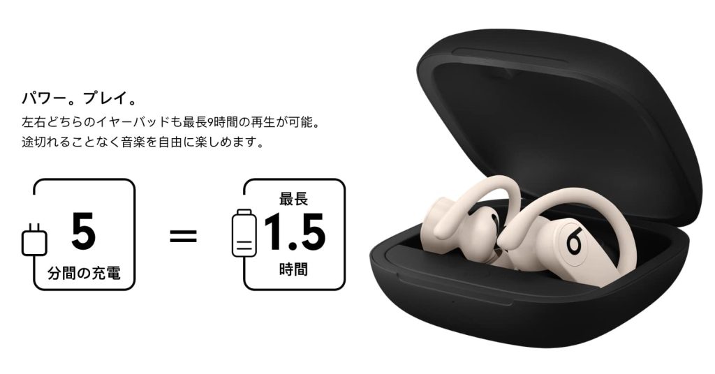 Powerbeats Proは、1回の充電で最大9時間の連続再生が可能で、充電ケースを使用すればさらに24時間以上の再生が可能です。長時間の通勤やフィットネス、さらには長時間の外出にも十分対応でき、日中の使用ではバッテリーの心配をすることなく音楽を楽しむことができます。さらに、急速充電機能も搭載されており、わずか5分の充電で1.5時間の再生が可能なため、急ぎの際にも便利です。