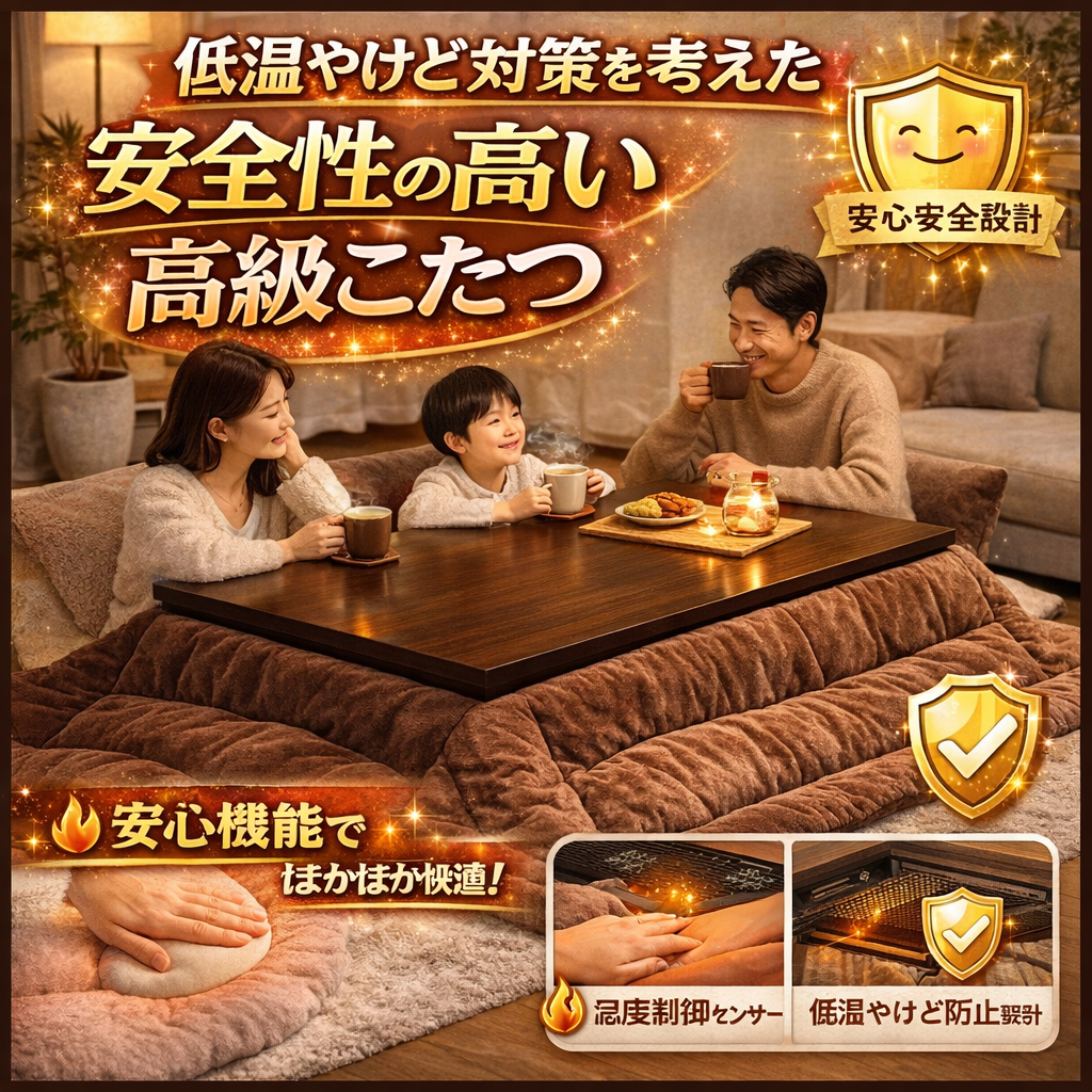 - 「安全にあたたまる」が主役。低温やけど対策を意識した高級こたつという選び方