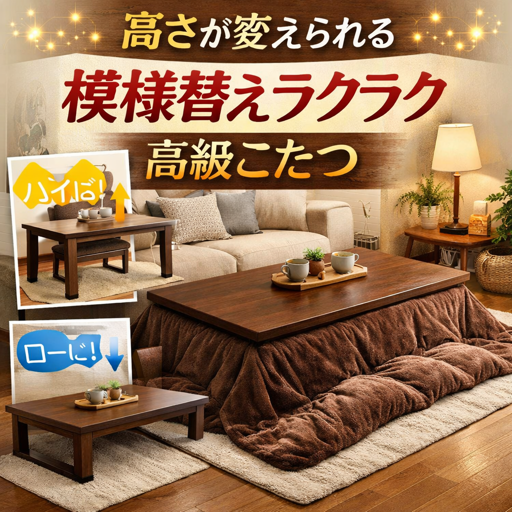 だからこそ、「高さが変えられて模様替えしやすい高級こたつ」という検索にたどり着く人が増えてます。つまりあなたは、季節や気分、部屋のレイアウトに合わせて“暮らしを動かせる”こたつが欲しい人。